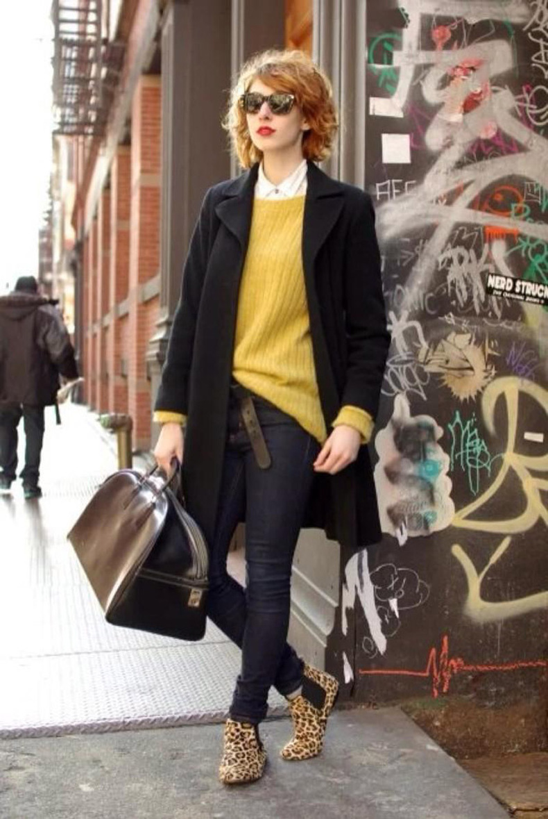需要提醒的是,如果也选择了一件宽松稍长的明黄毛衣,记得像模特这样也耍个小心机,把衣摆的一段扎进裤子里去,1:1的比例肯定不是你想要。